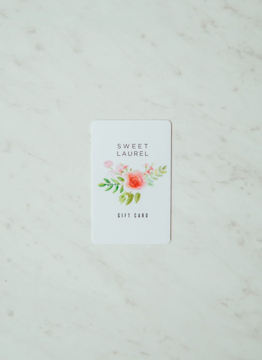 Send Sweet Laurel to someone you love! Online Store Gifts Cards are valid for any product on www.sweetlaurel.com. Gift cards are delivered by email and contain instructions to redeem them at checkout. Our gift cards have no additional processing fees. This gift card is valid only at www.sweetlaurel.com - it will not work at our brick and mortar store. For brick and mortar store gift cards click me.