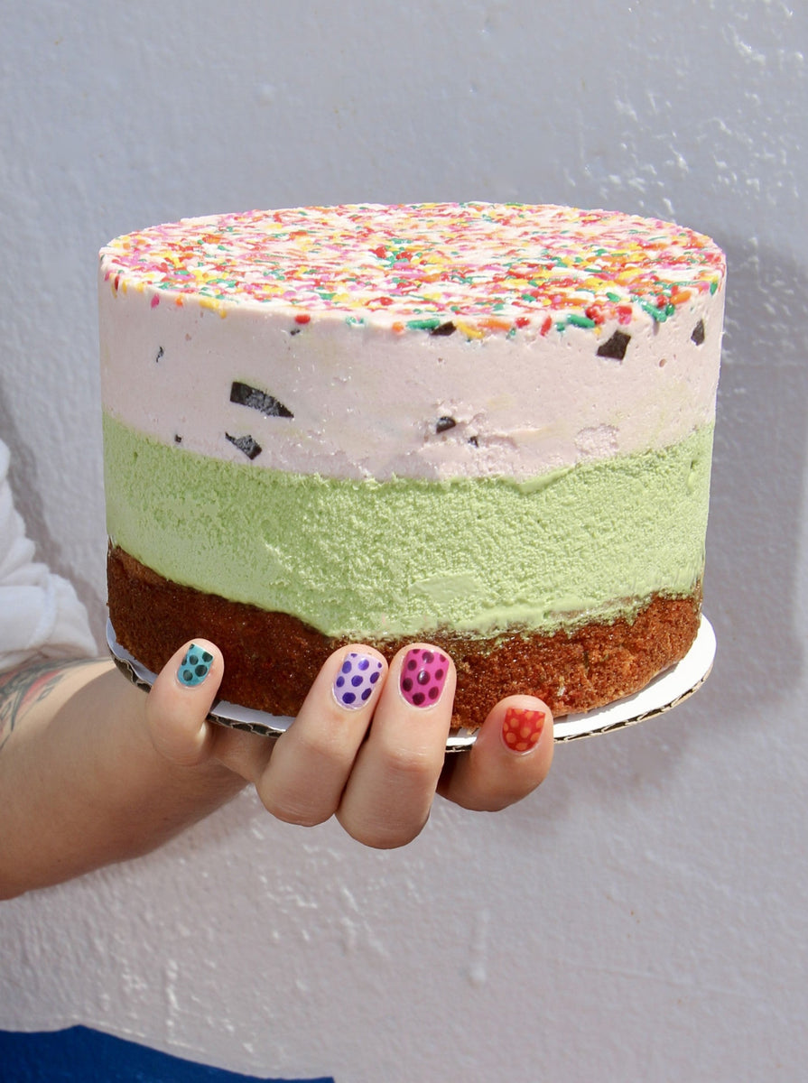 Celebrate with us this month with our colorful sprinkle filled cake! Available in 9 inch or 6 inch. 1 layer of Confetti Cake, 1 layer of Matcha Ice Cream Ice Cream, and 1 layer of Chocolate Dipped Strawberry Ice Cream. Topped with rainbow sprinkles.
