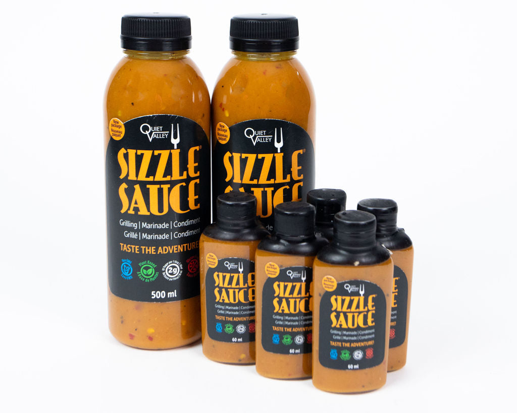 The combo pack contains 2 - 500 ml bottles and 5 - 60ml Sizzle minis. Sizzle minis are perfect for taking camping, snowmobiling, having a Sizzle stash at work or in your purse! Sizzle Sauce is a delicious gluten free and plant based grilling sauce, condiment and marinade created to enhance, not mask, the natural flavour of your food. Greg (the Sauce Boss) is diabetic so he sweetens primarily with apple cider vinegar to keep the sugars low. This gives Sizzle a tangy heat straight up that mellows when cooked. It’s versatility means you can use it on everything from chicken wings to scrambled eggs, tofu crutons to crockpot pulled pork.