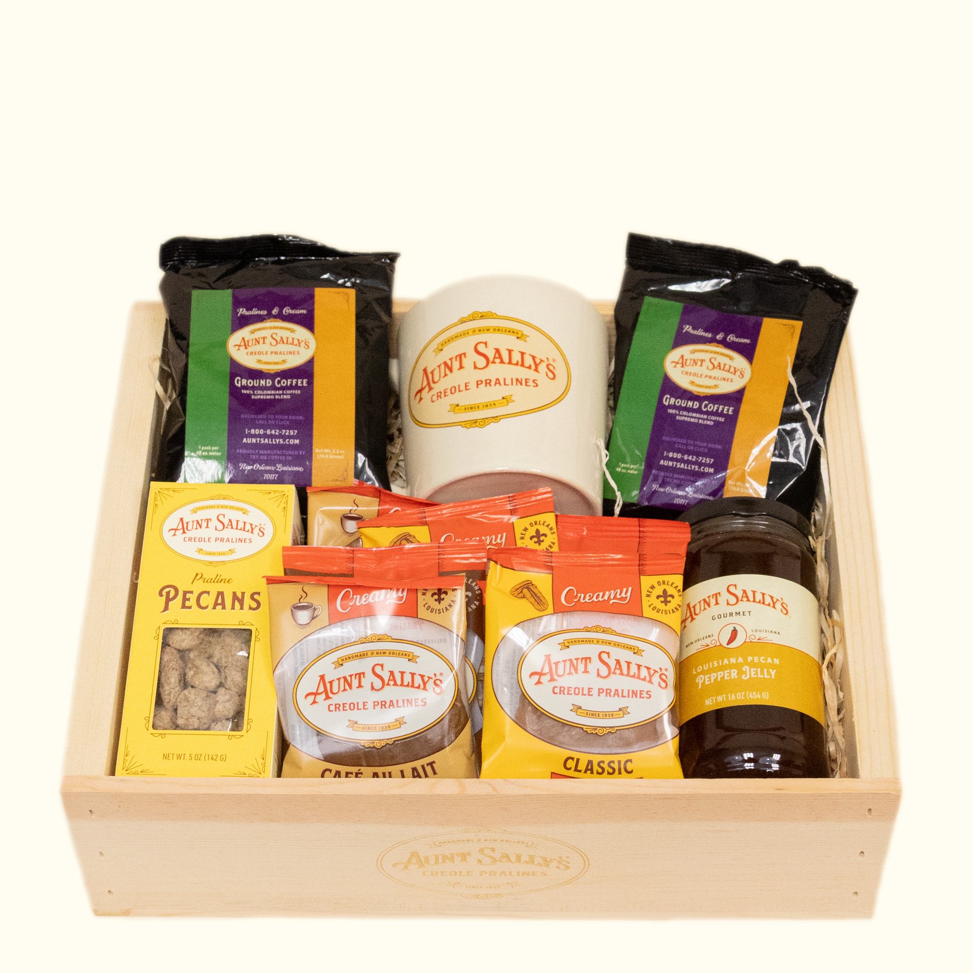 A perfect gift for friends and family who are missing New Orleans or want to get a small taste of all this great city has to offer! This popular gift basket includes: 12 Assorted Creamy Pralines, 1 5oz box Aunt Sally’s Praline Coated Pecans, 1 Aunt Sally's Pralines Logo Mug, 2 packages of Aunt Sally's Pralines & Cream Coffee 2.5 oz, 1 jar of Louisiana Pecan Pepper Jelly. PICK A RIBBON THEME to complete your basket!