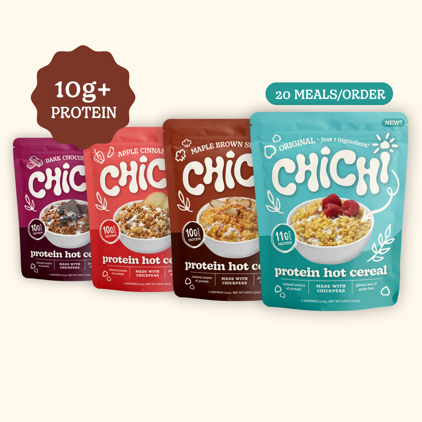 Enjoy four resealable bags (20 servings) of protein packed hot cereal made with chickpeas! It’s high in protein and fiber, lower in sugar, and easy to make in the microwave or on the stove. Choose one or a variety of our four flavors below.
