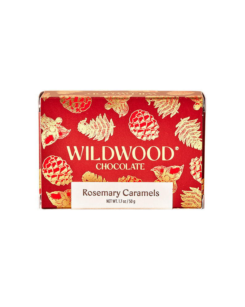 Herbaceous floral rosemary enhances this smooth, perfectly textured caramel. Five pieces per box. Compostable wrappers. |